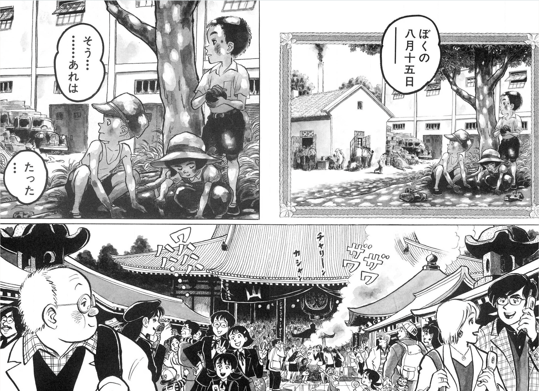 ちばてつや作品といえば、驚くほど緻密な描写が魅力です。自宅・プロダクションがある練馬の街並み、山積みの本や原稿が雑然と置かれている仕事場、修学旅行生や観光客でにぎわう浅草寺、そして1945年8月15日とその後の満州の冬──どれも確かにあった光景が描かれています。これらは単なる背景ではなく“生きた空間”として、見る者に事実を訴えかけてくるようです。